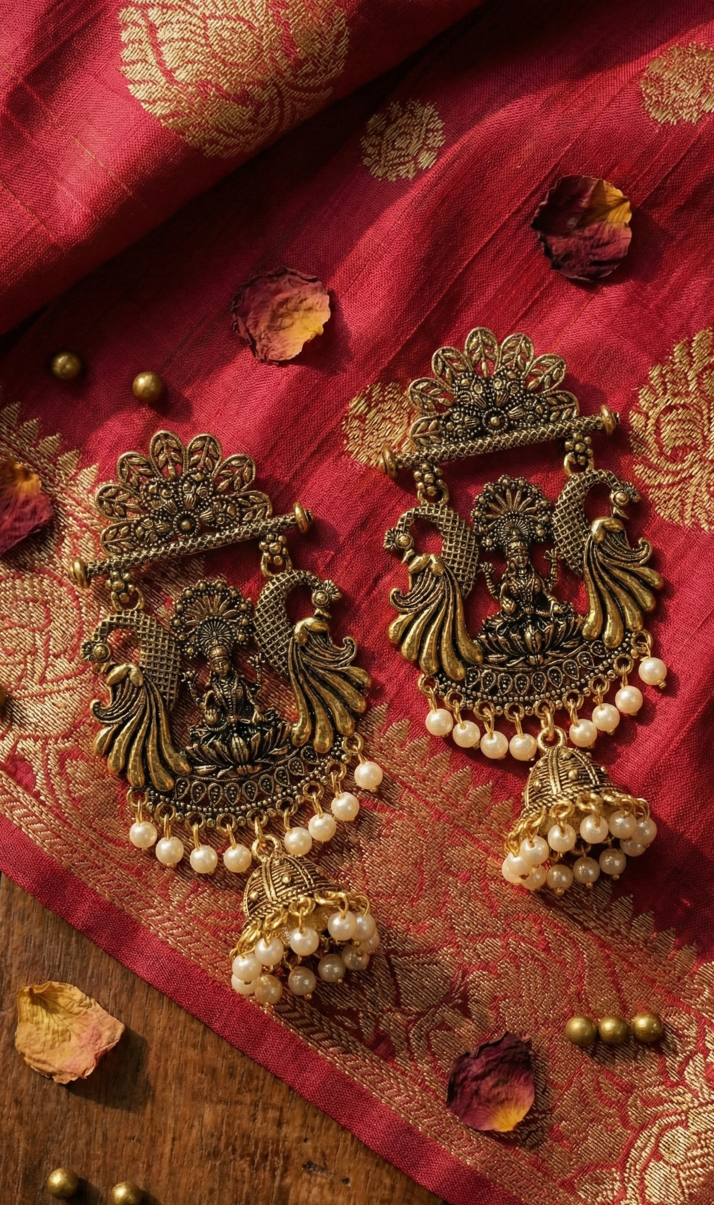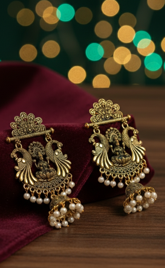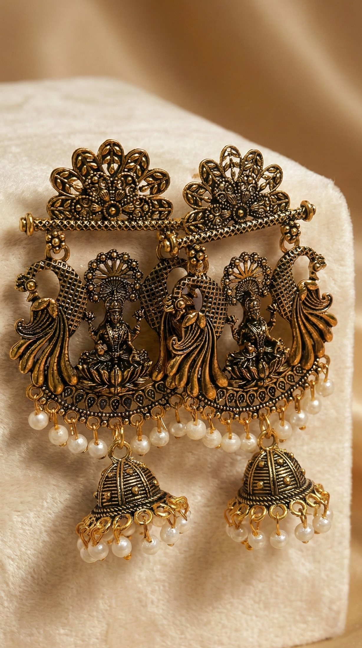 Elegant oxidised premium earrings with intricate detailing and antique golden finish. Perfect for adding a traditional yet stylish touch to any outfit to style your festive or everyday look. Lightweight, durable, and timeless.